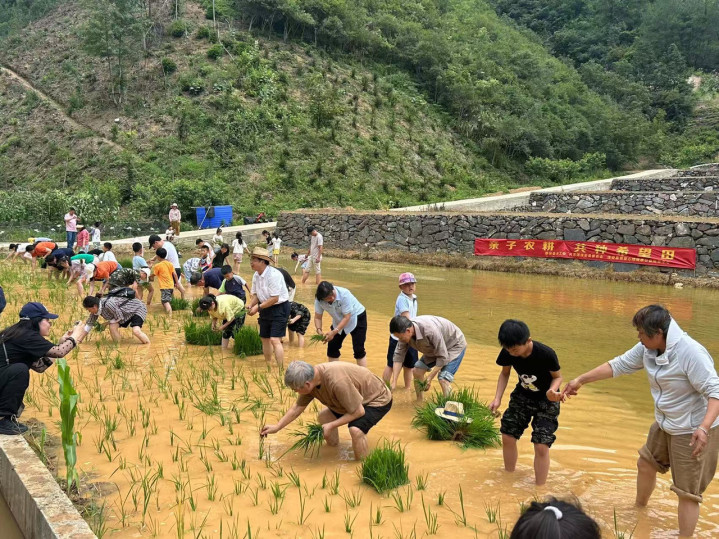 在农业技术人员与“五老”志愿者指导下,亲子家庭分组开展插秧体验。